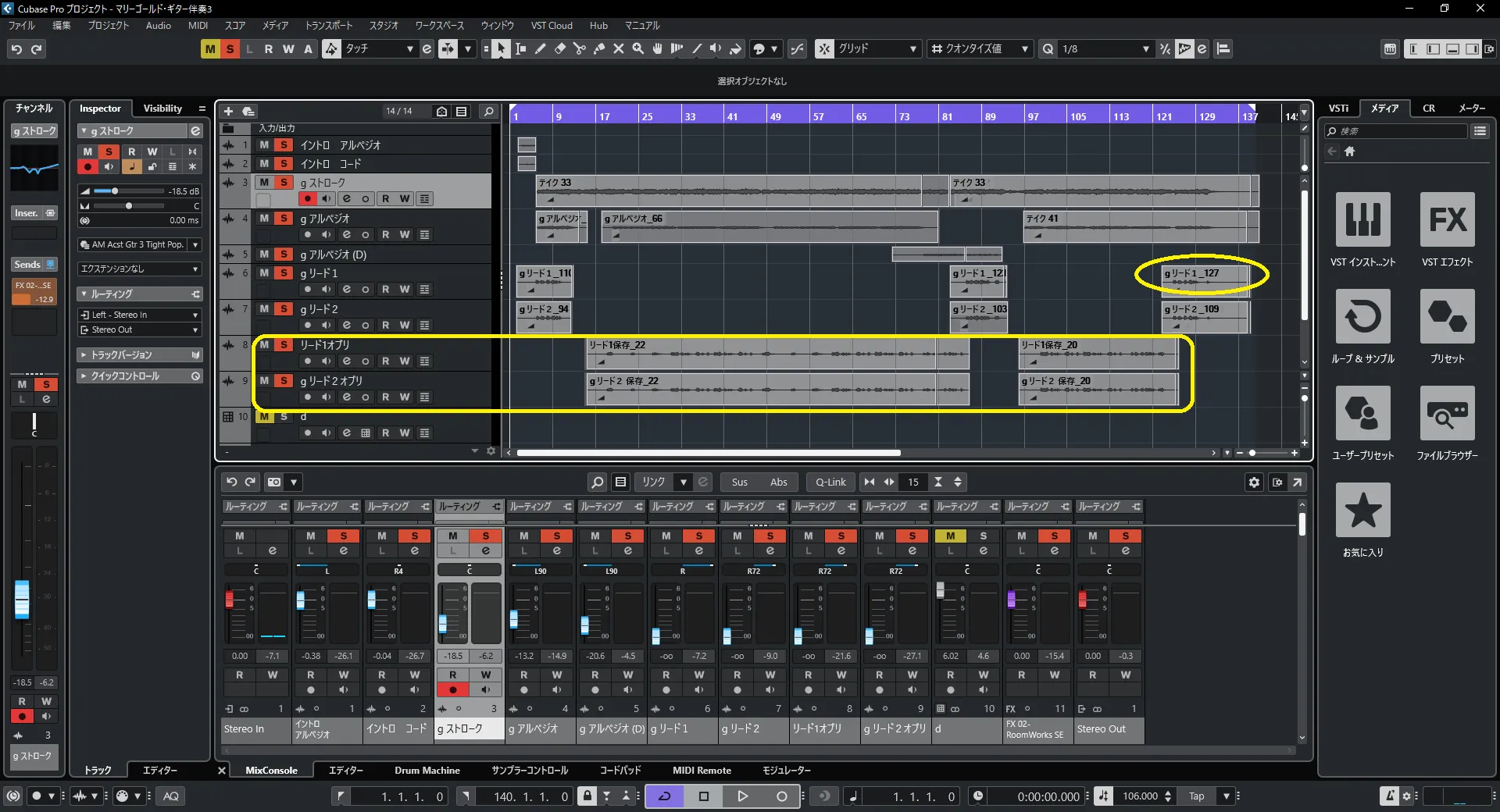 「リードギター1」ってこの画面だと127テイク録ってます。